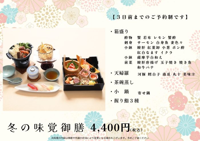 ※お料理の内容は、季節や市場の状況により多少異なる場合もございます。あらかじめご了承下さいませ
